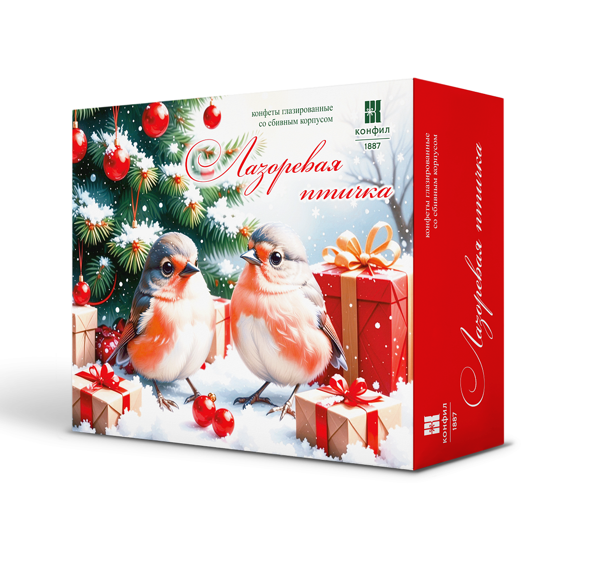 Конфеты с нежным сбивным корпусом на основе агара, сливочного масла и сгущенного молока с тремя вкусами: ваниль, лимон, миндаль и ром, покрытые шоколадной глазурью, в новогоднем дизайне. Новогодняя продукция в год Красной Огненной Лошади 2026.
