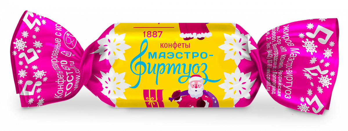 Глазированные конфеты на основе цельного сухого молока с добавлением корицы и вафельной крошки в новогоднем дизайне. Новогодняя продукция в год Красной Огненной Лошади 2026.
